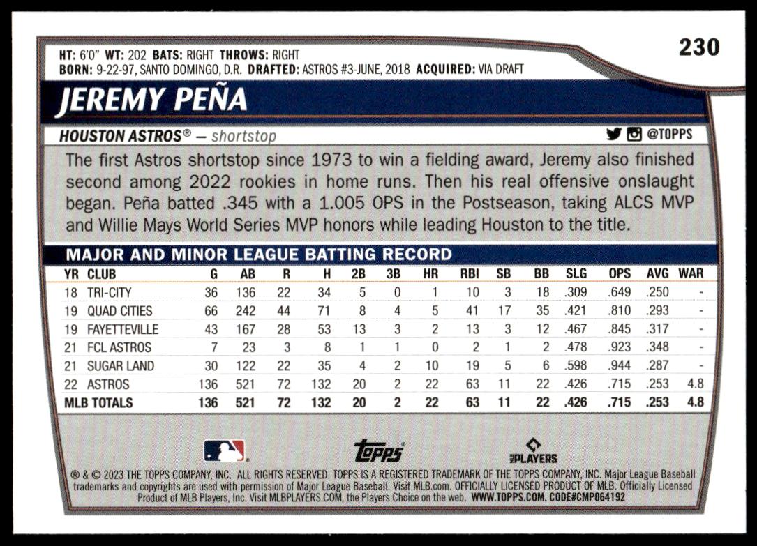 This Baseball card, from 2023 is part of the Topps Big League card set. Jeremy Peña is featured and has a card number of 230.