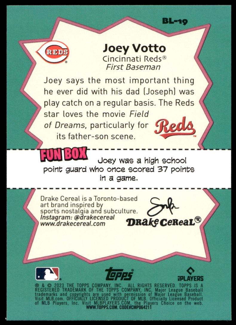 This Baseball card, from 2023 is part of the Topps Big League card set. Joey Votto is featured and has a card number of BL-19.