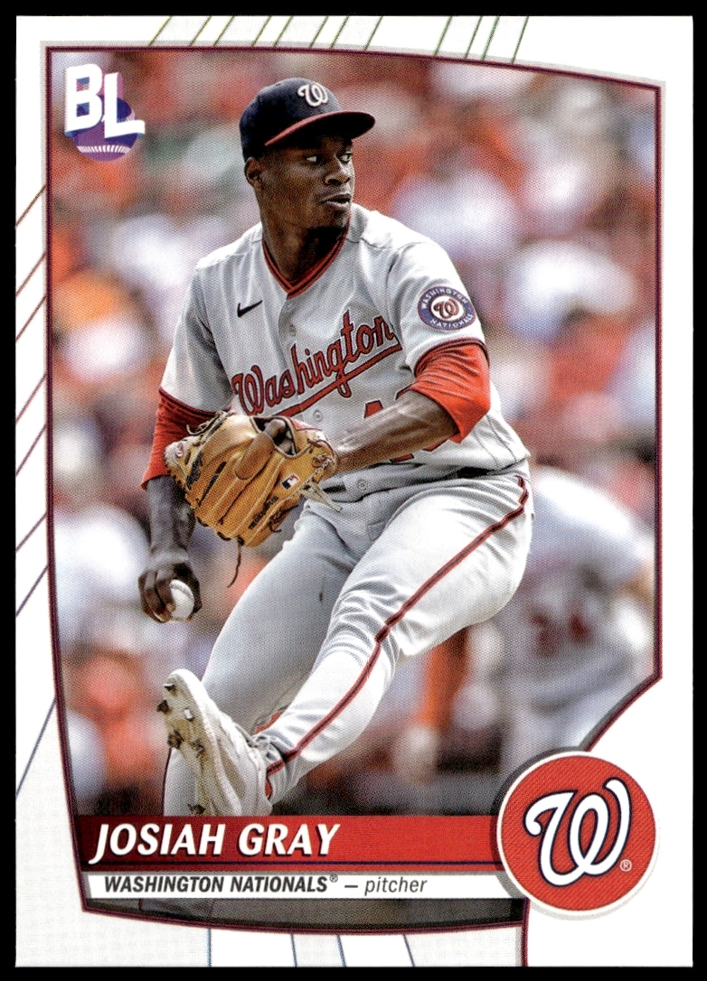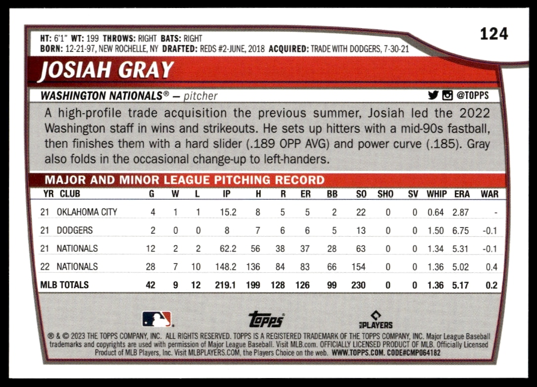 This Baseball card, from 2023 is part of the Topps Big League card set. Josiah Gray is featured and has a card number of 124.