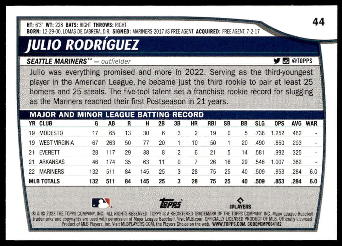 This Baseball card, from 2023 is part of the Topps Big League card set. Julio Rodriguez is featured and has a card number of 44.