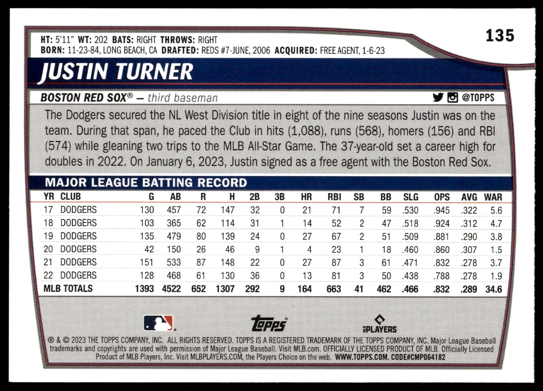 This Baseball card, from 2023 is part of the Topps Big League card set. Justin Turner is featured and has a card number of 135.