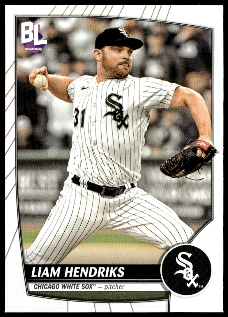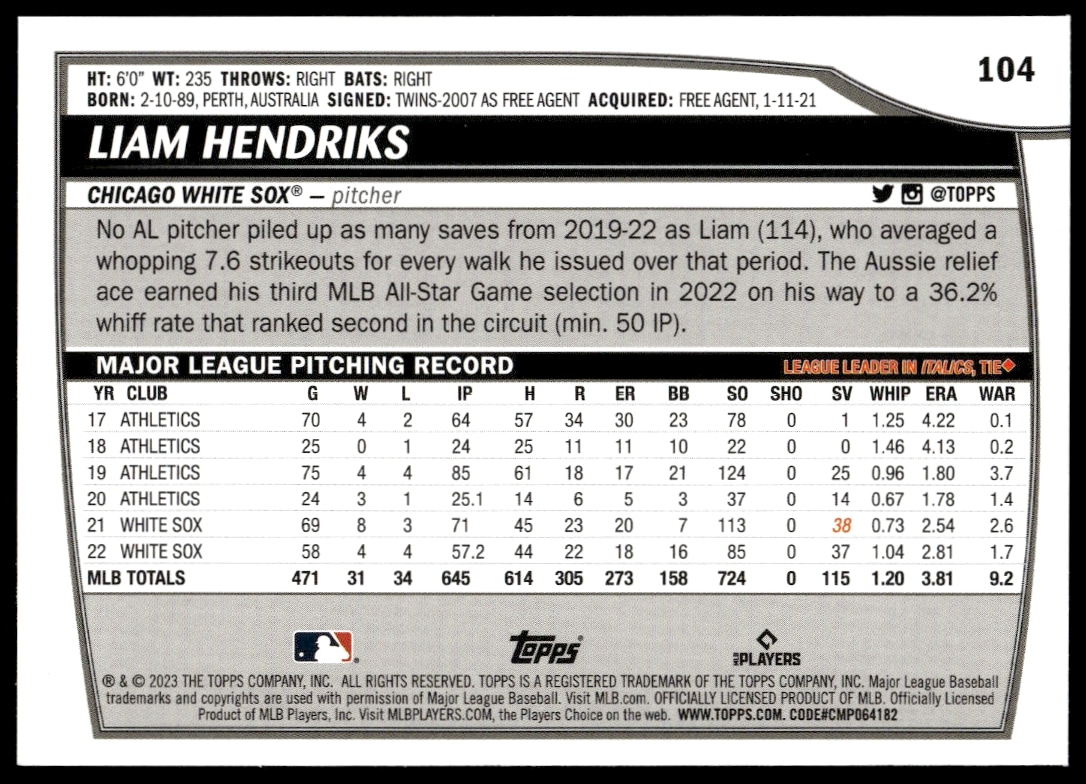 This Baseball card, from 2023 is part of the Topps Big League card set. Liam Hendriks is featured and has a card number of 104.