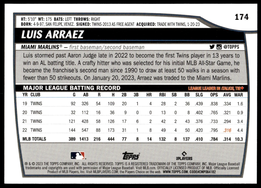 This Baseball card, from 2023 is part of the Topps Big League card set. Luis Arraez is featured and has a card number of 174.