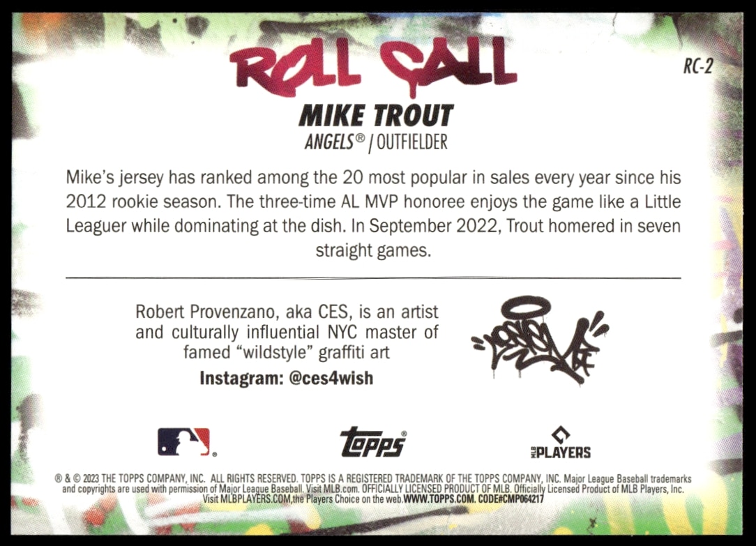 This Baseball card, from 2023 is part of the Topps Big League card set. Mike Trout is featured and has a card number of RC-2.