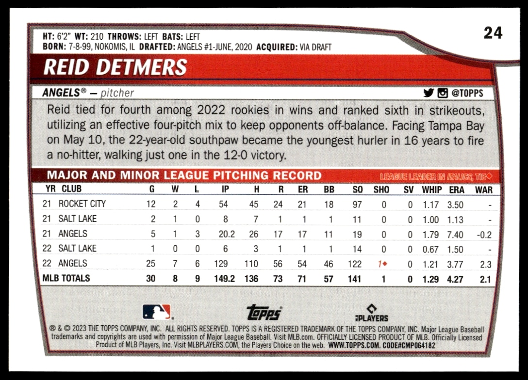 This Baseball card, from 2023 is part of the Topps Big League card set. Reid Detmers is featured and has a card number of 24.