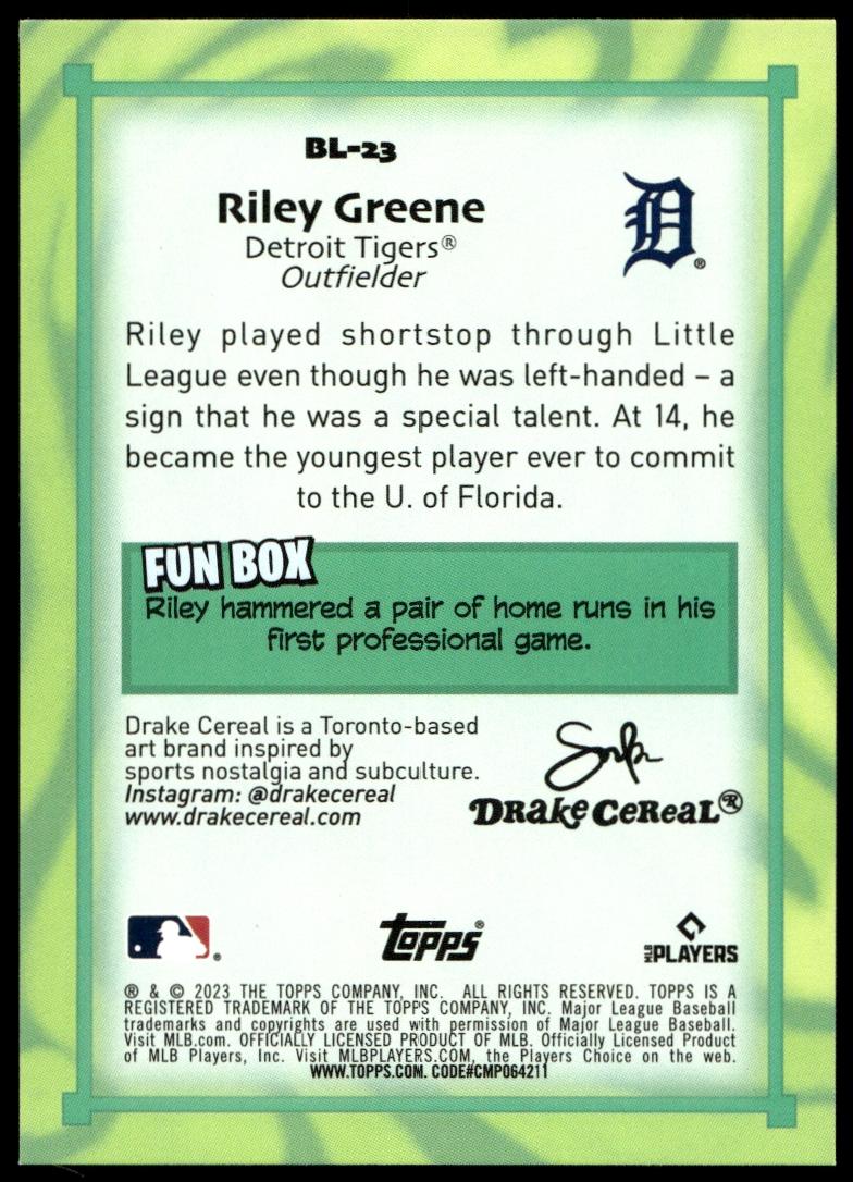 This BaseballΒ card, from 2023 is part of the Topps Big LeagueΒ card set. Riley Greene is featured and has a card number of BL-23.