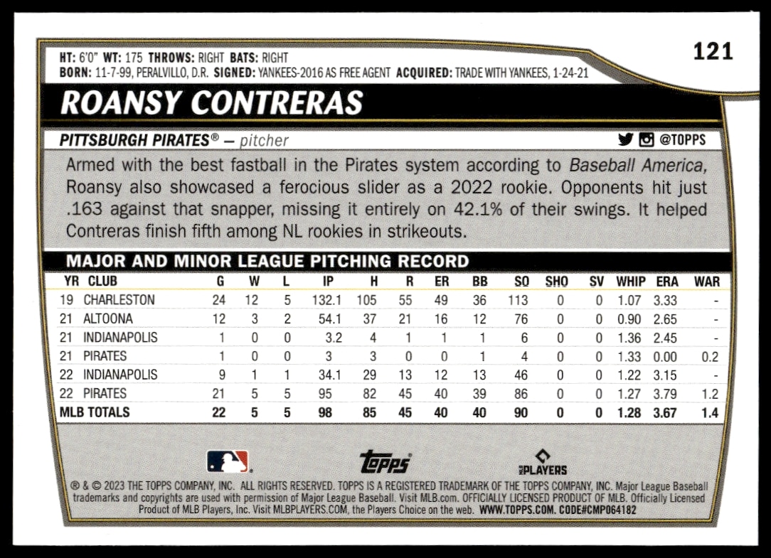 This Baseball card, from 2023 is part of the Topps Big League card set. Roansy Contreras is featured and has a card number of 121.