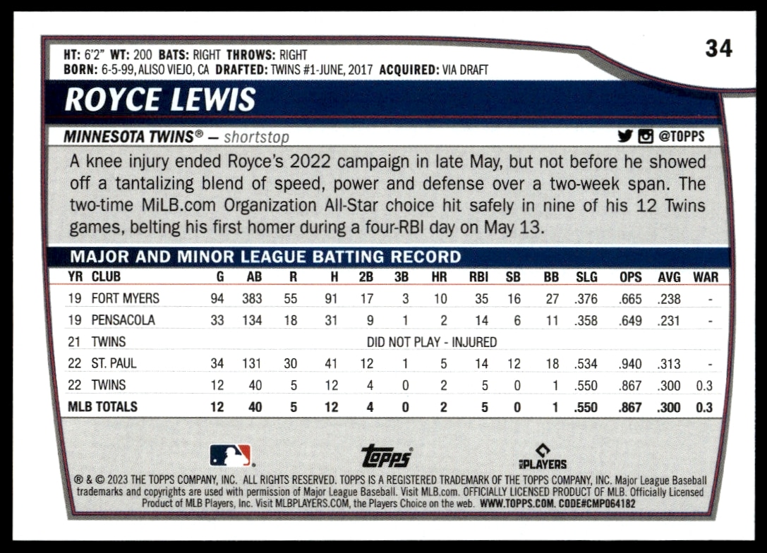 This Baseball card, from 2023 is part of the Topps Big League card set. Royce Lewis is featured and has a card number of 34.
