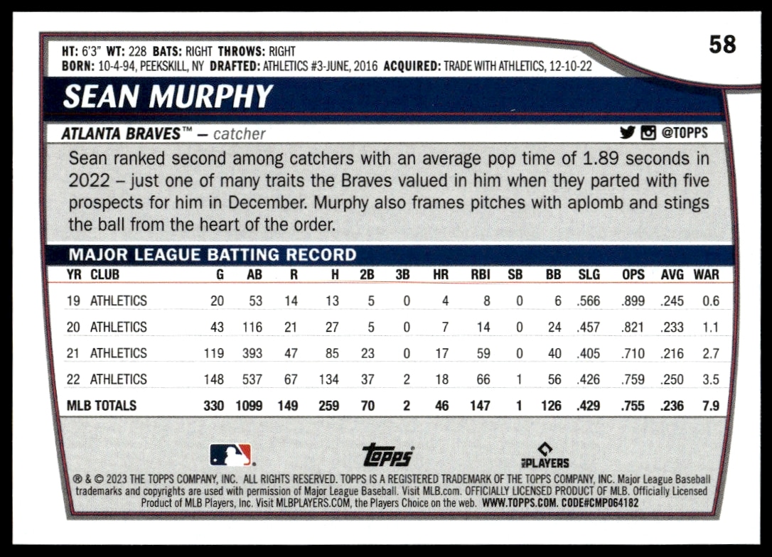 This Baseball card, from 2023 is part of the Topps Big League card set. Sean Murphy is featured and has a card number of 58.