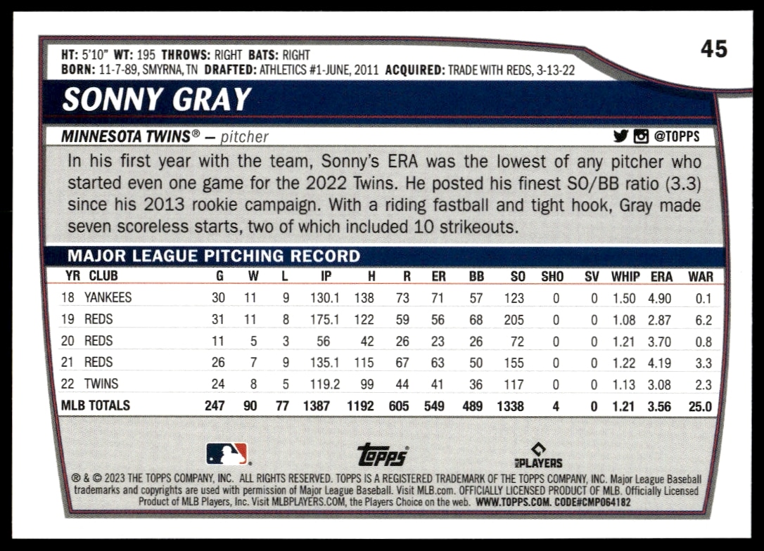 This BaseballΒ card, from 2023 is part of the Topps Big LeagueΒ card set. Sonny Gray is featured and has a card number of 45.