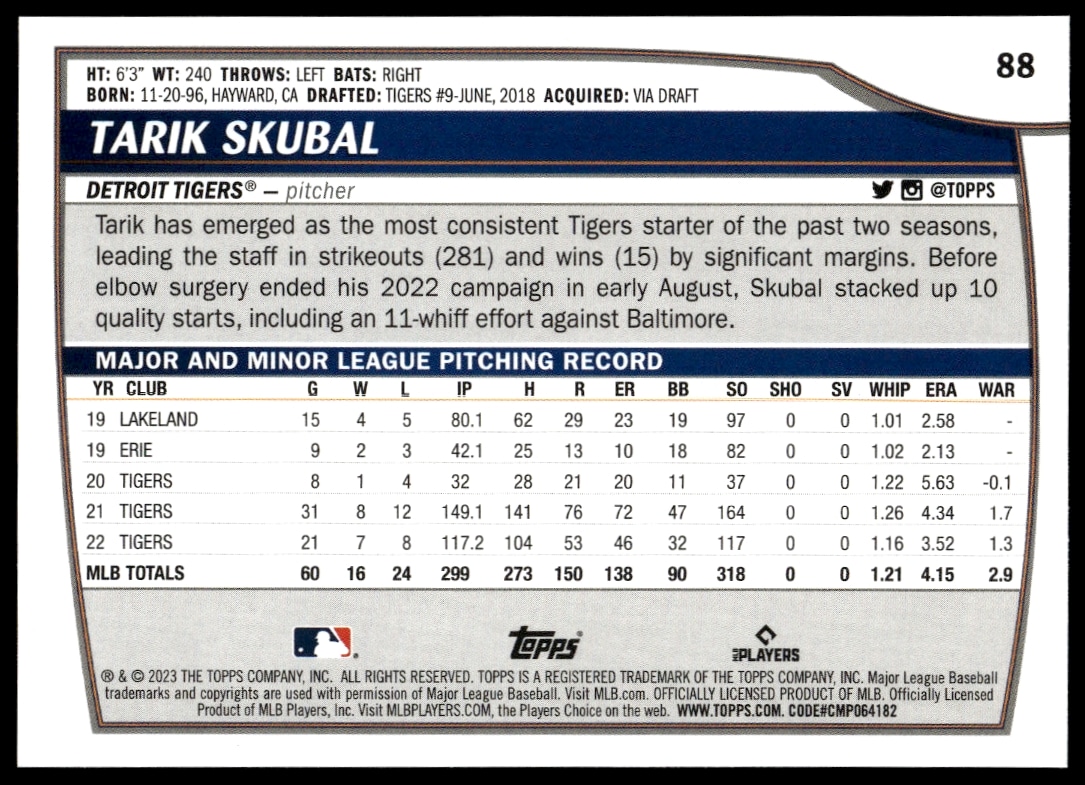 This Baseball card, from 2023 is part of the Topps Big League card set. Tarik Skubal is featured and has a card number of 88.