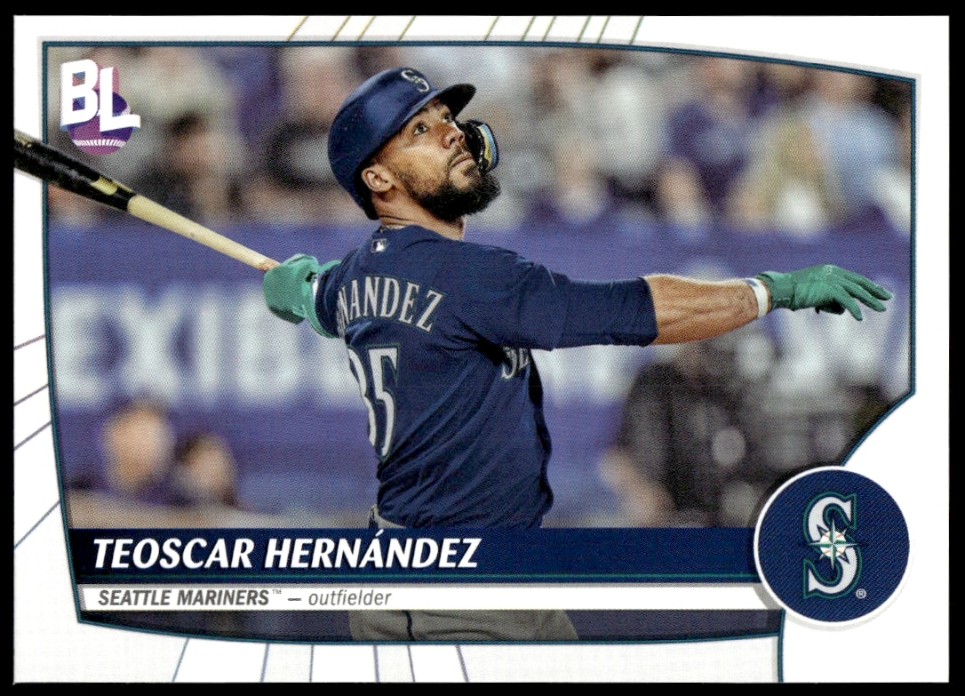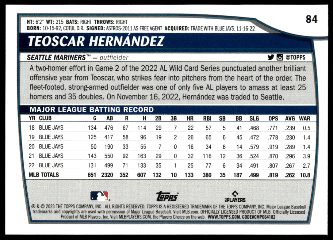 This Baseball card, from 2023 is part of the Topps Big League card set. Teoscar Hernandez is featured and has a card number of 84.