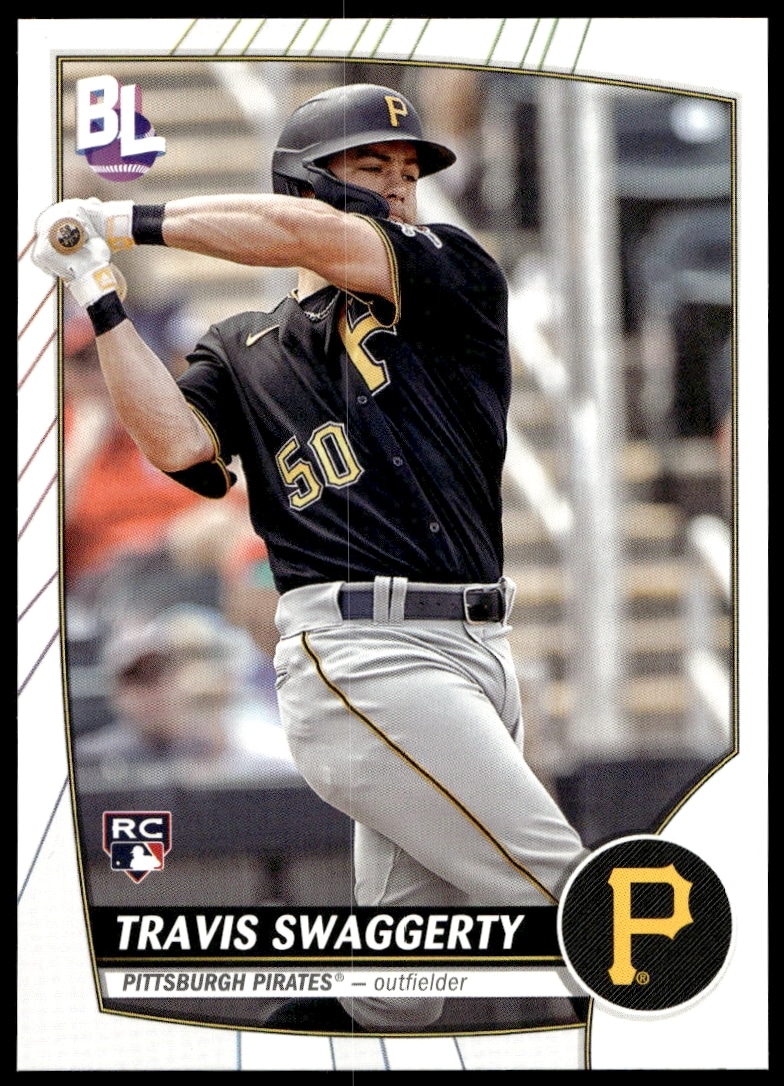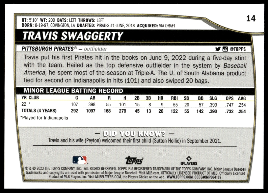 This Baseball card, from 2023 is part of the Topps Big League card set. Travis Swaggerty is featured and has a card number of 14.