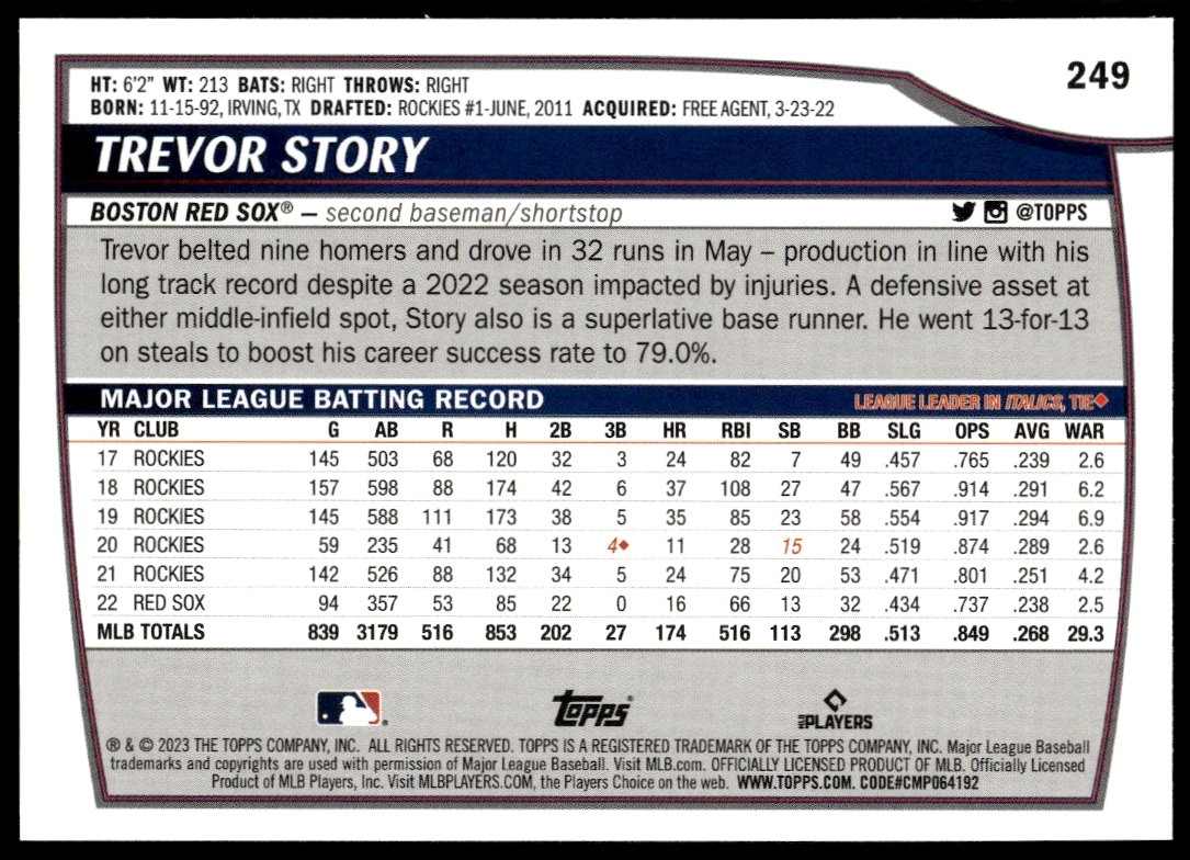 This BaseballΒ card, from 2023 is part of the Topps Big LeagueΒ card set. Trevor Story is featured and has a card number of 249.