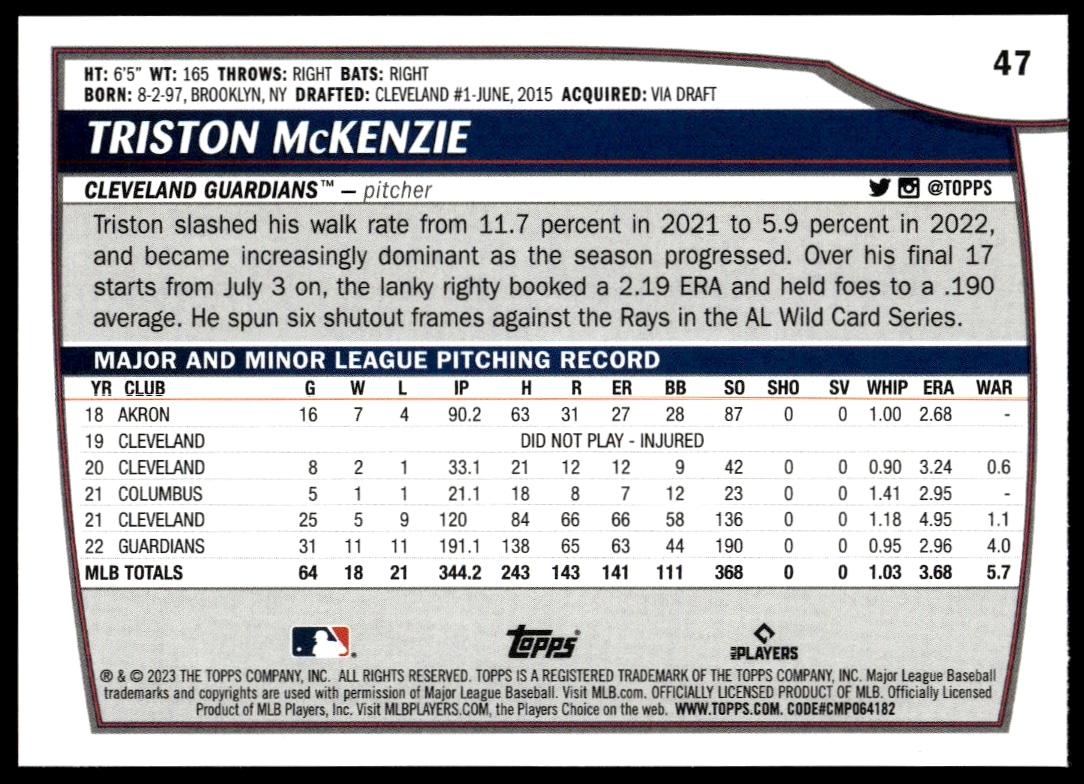 This Baseball card, from 2023 is part of the Topps Big League card set. Triston McKenzie is featured and has a card number of 47.