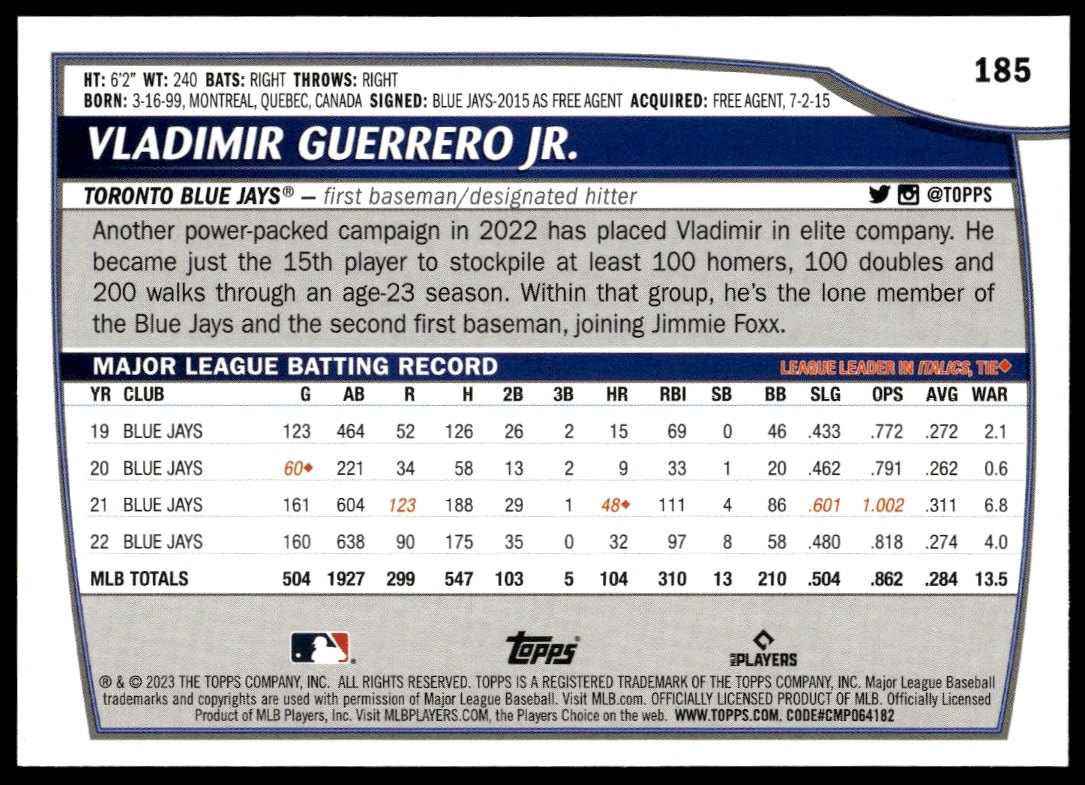 This Baseball card, from 2023 is part of the Topps Big League card set. Vladimir Guerrero Jr. is featured and has a card number of 185.