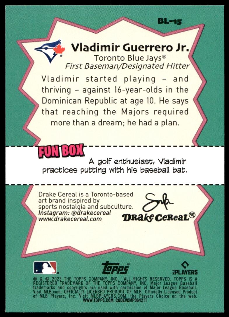 This BaseballΒ card, from 2023 is part of the Topps Big LeagueΒ card set. Vladimir Guerrero Jr. is featured and has a card number of BL-15.