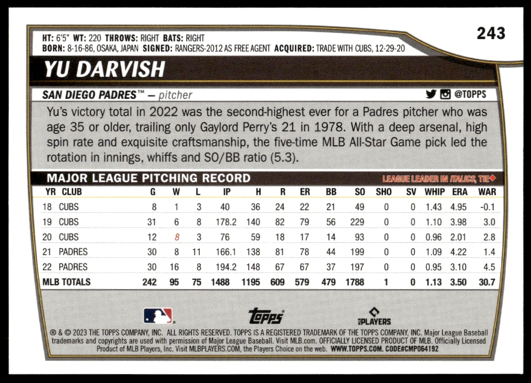 This Baseball card, from 2023 is part of the Topps Big League card set. Yu Darvish is featured and has a card number of 243.