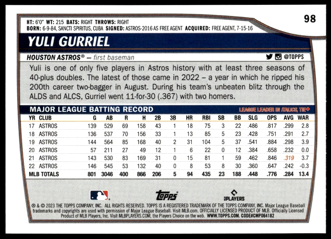 This Baseball card, from 2023 is part of the Topps Big League card set. Yuli Gurriel is featured and has a card number of 98.