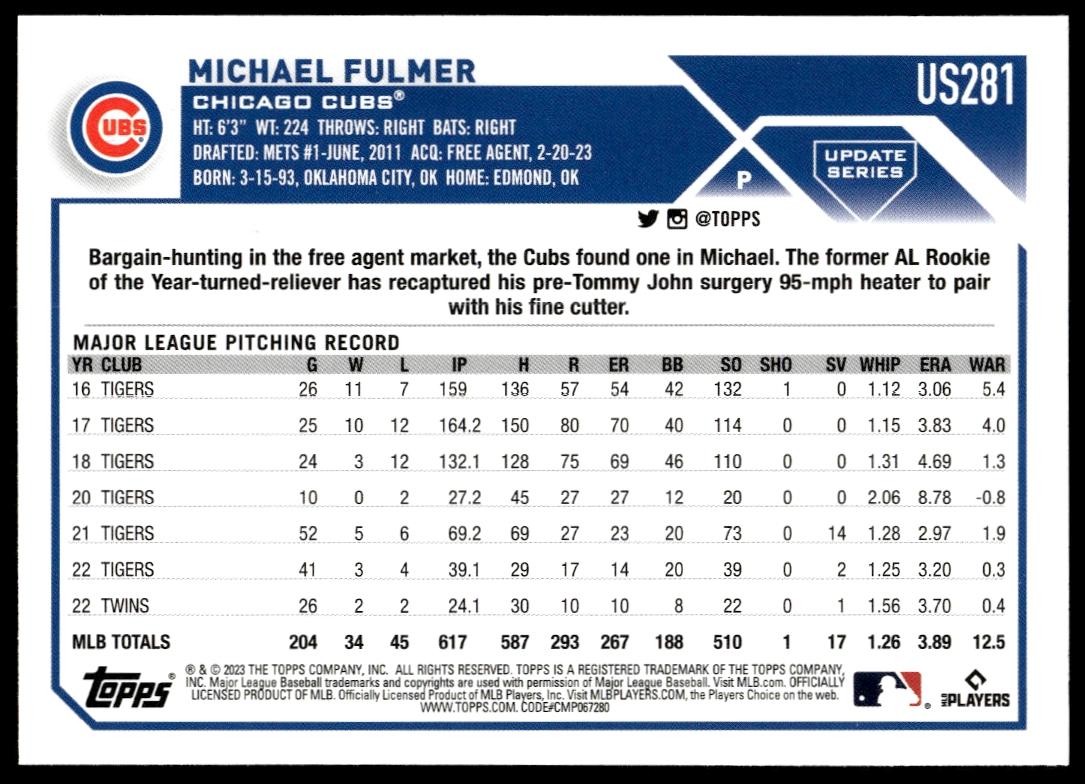 This BaseballΒ card, from 2023 is part of the Topps Chrome UpdateΒ card set. Michael Fulmer is featured and has a card number of USC183.