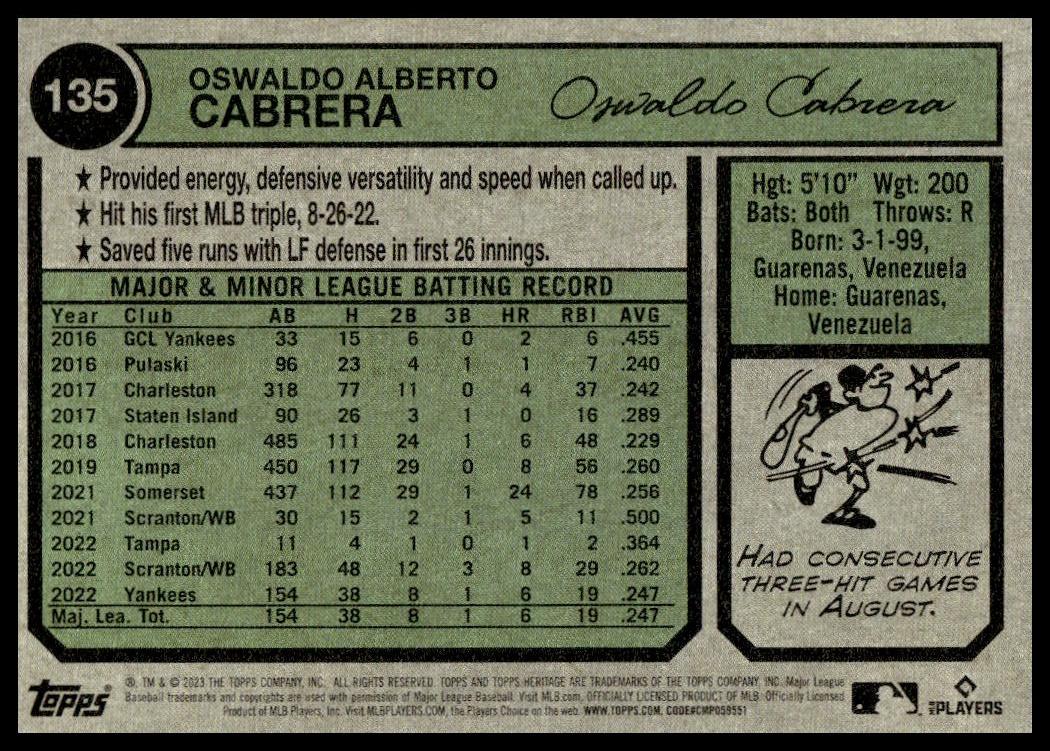 This Baseball card, from 2023 is part of the Topps Heritage card set. Oswaldo Cabrera is featured and has a card number of 135.