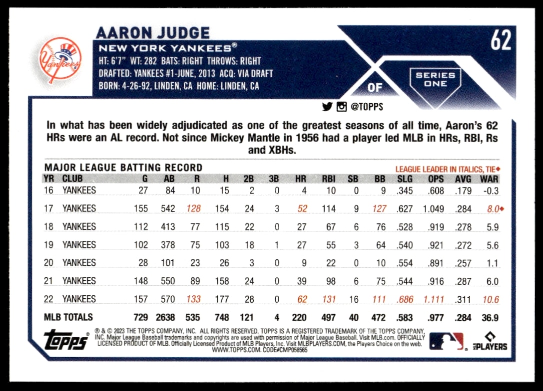 This Baseball card, from 2023 is part of the Topps Series 1 card set. Aaron Judge is featured and has a card number of 62.