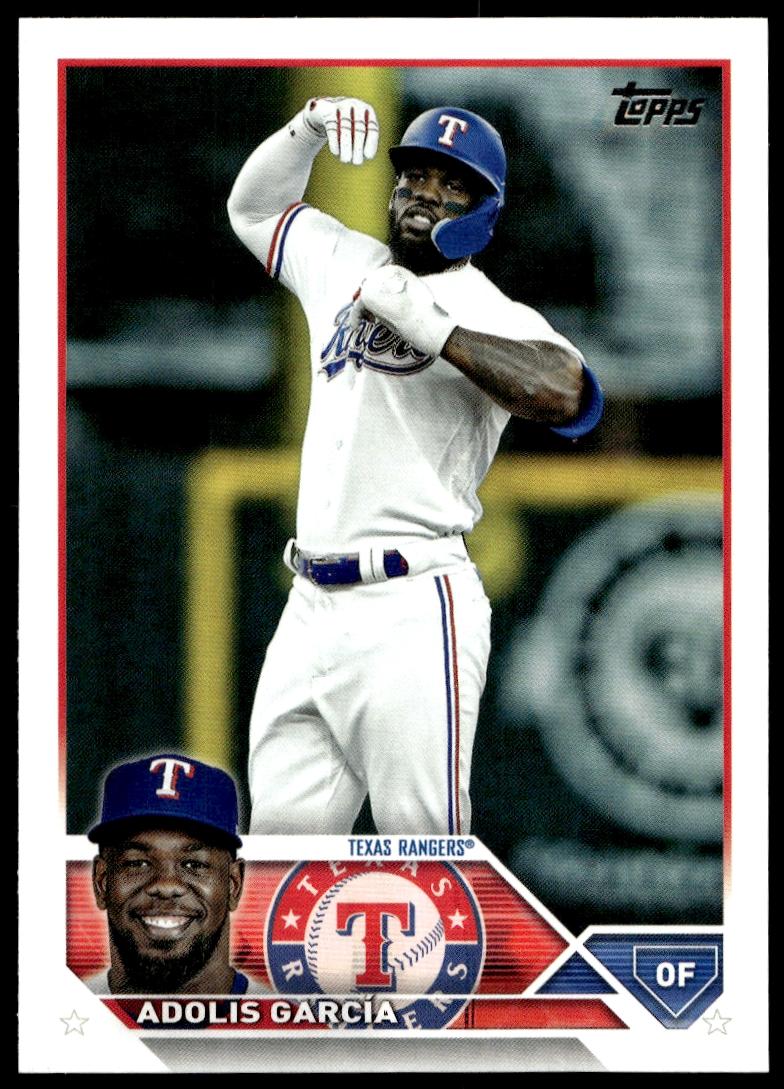 This Baseball card, from 2023 is part of the Topps Series 1 card set. Adolis García is featured and has a card number of 216.