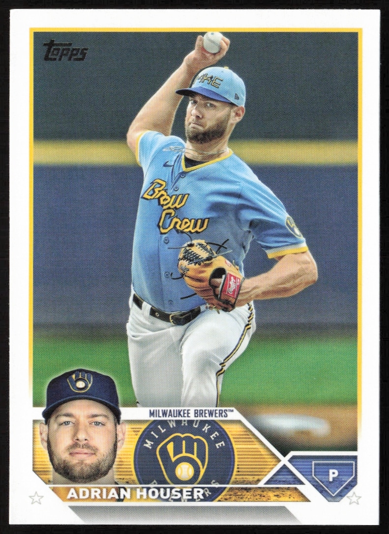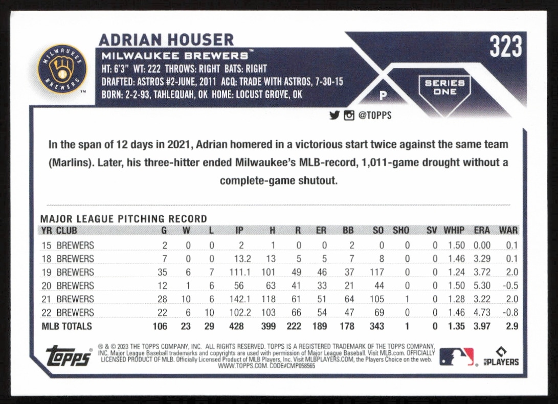 This Baseball card, from 2023 is part of the Topps Series 1 card set. Adrian Houser is featured and has a card number of 323.