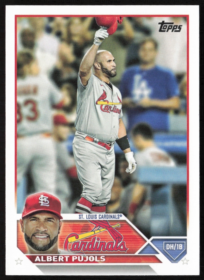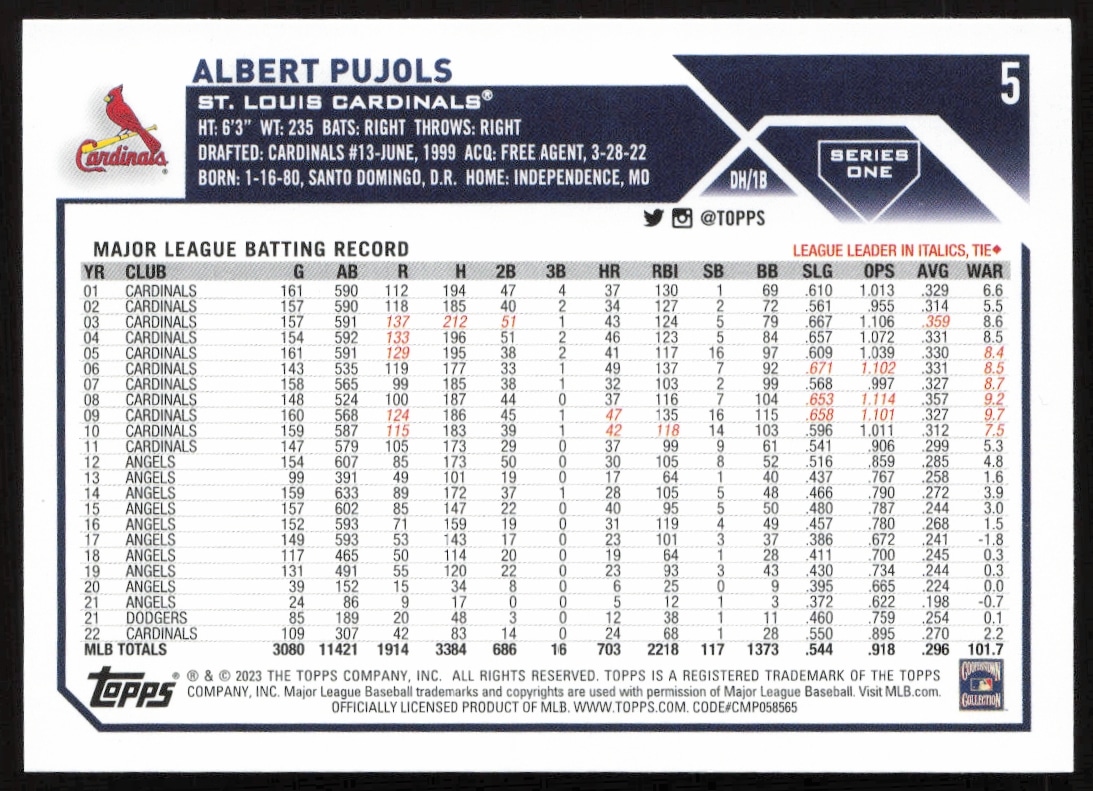 This Baseball card, from 2023 is part of the Topps Series 1 card set. Albert Pujols is featured and has a card number of 5.