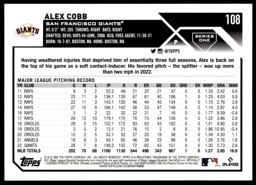 This Baseball card, from 2023 is part of the Topps Series 1 card set. Alex Cobb is featured and has a card number of 108.