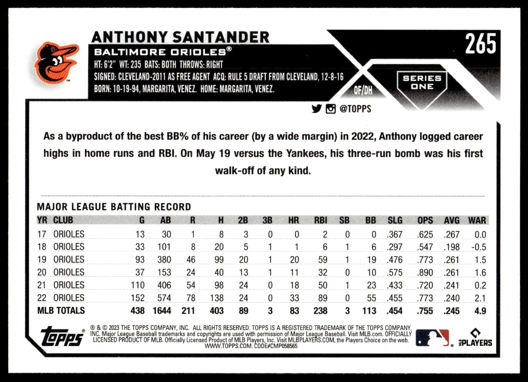 This Baseball card, from 2023 is part of the Topps Series 1 card set. Anthony Santander is featured and has a card number of 265.