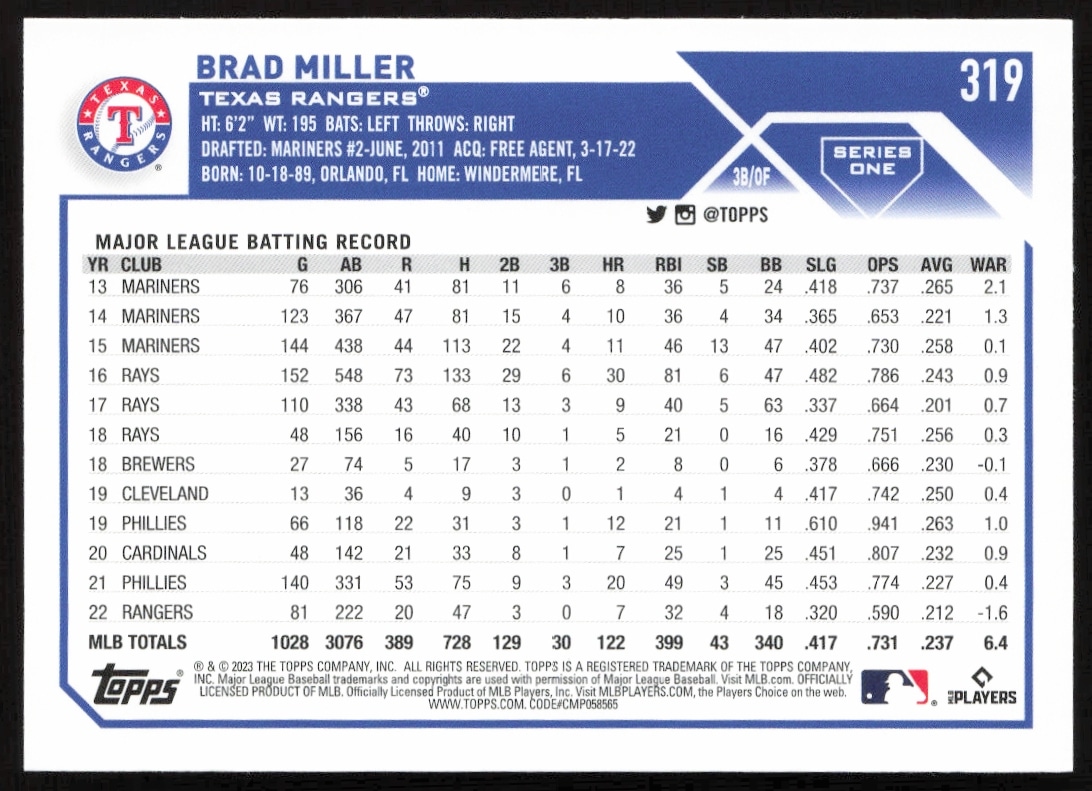 This Baseball card, from 2023 is part of the Topps Series 1 card set. Brad Miller is featured and has a card number of 319.