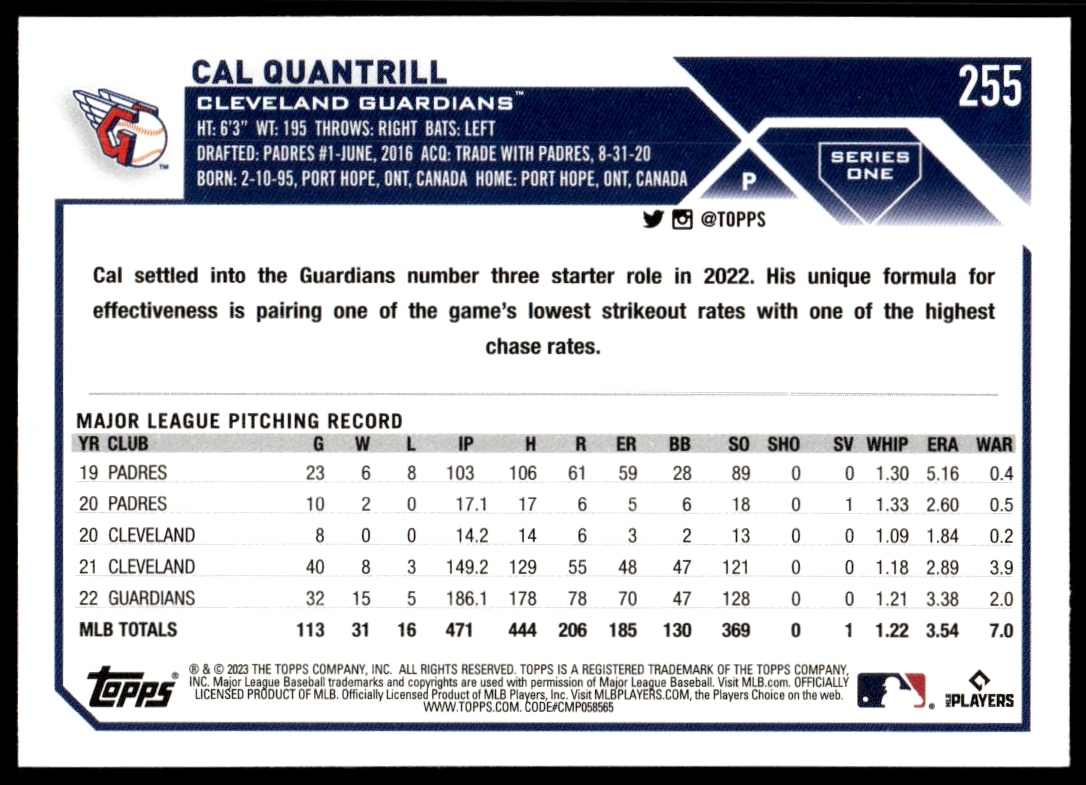 This Baseball card, from 2023 is part of the Topps Series 1 card set. Cal Quantrill is featured and has a card number of 255.