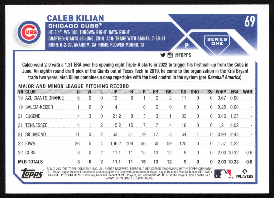 This Baseball card, from 2023 is part of the Topps Series 1 card set. Caleb Kilian is featured and has a card number of 69.