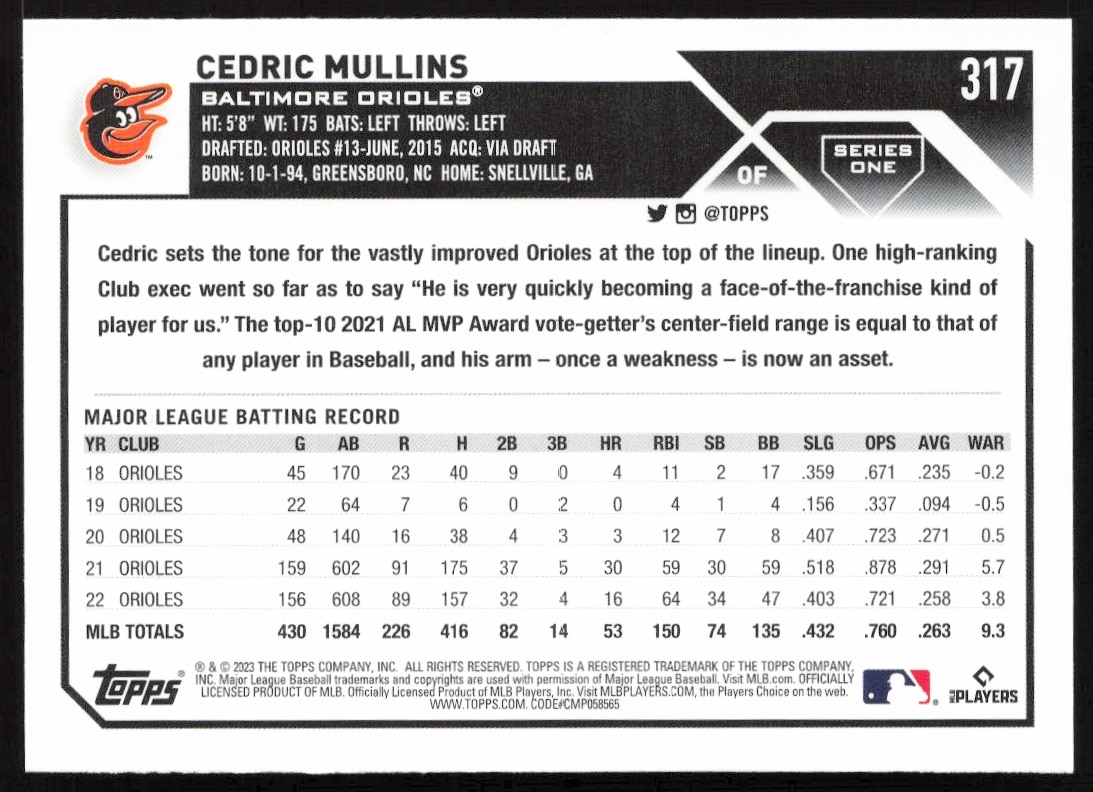 This Baseball card, from 2023 is part of the Topps Series 1 card set. Cedric Mullins is featured and has a card number of 317.
