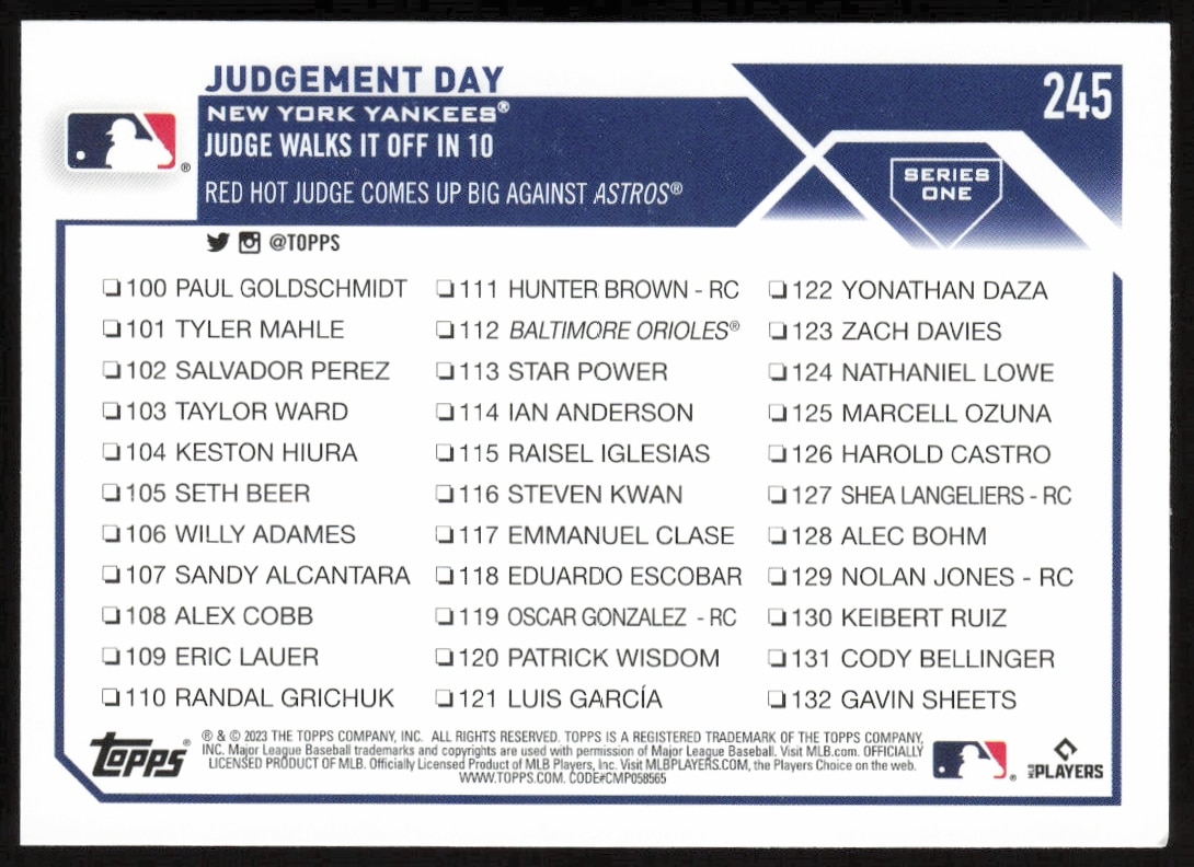 This Baseball card, from 2023 is part of the Topps Series 1 card set. Judgement Day Checklist is featured and has a card number of 245.