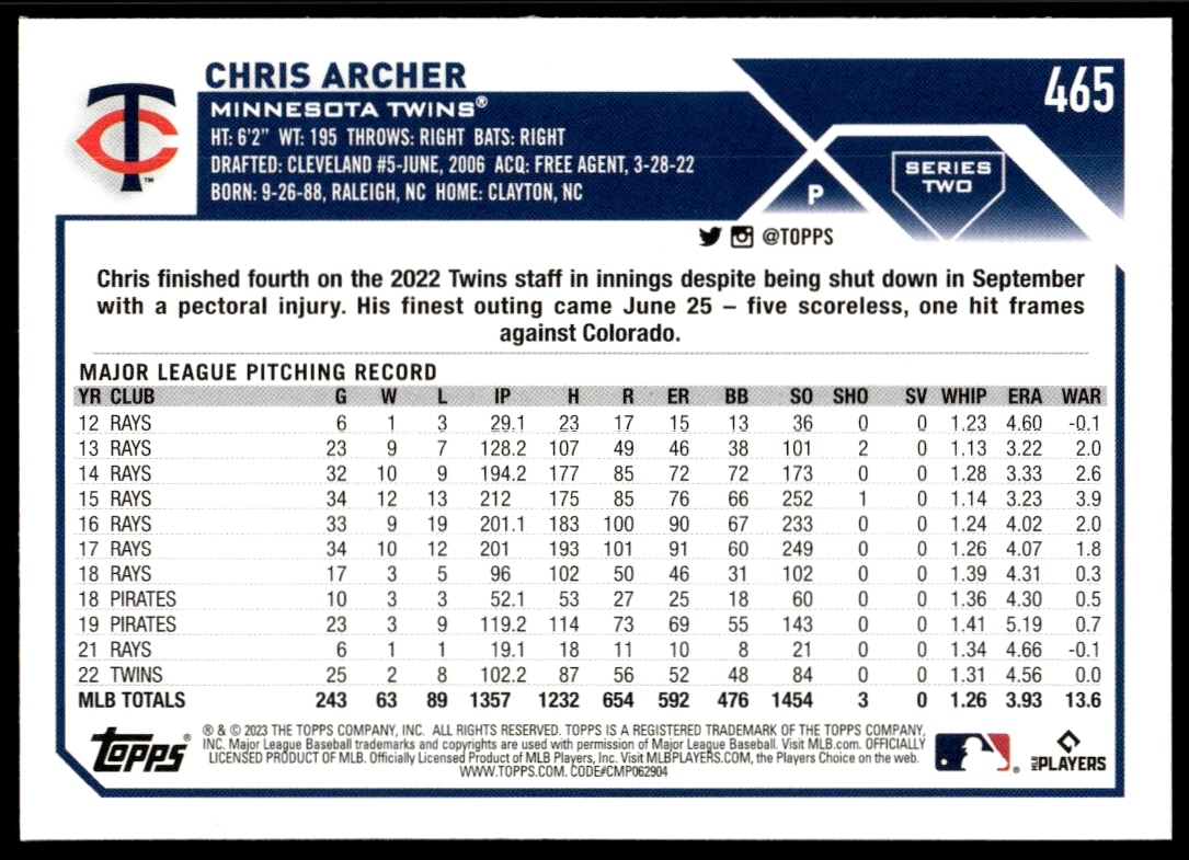 Home Β» 2023 Topps Series 1 Chris Archer #465