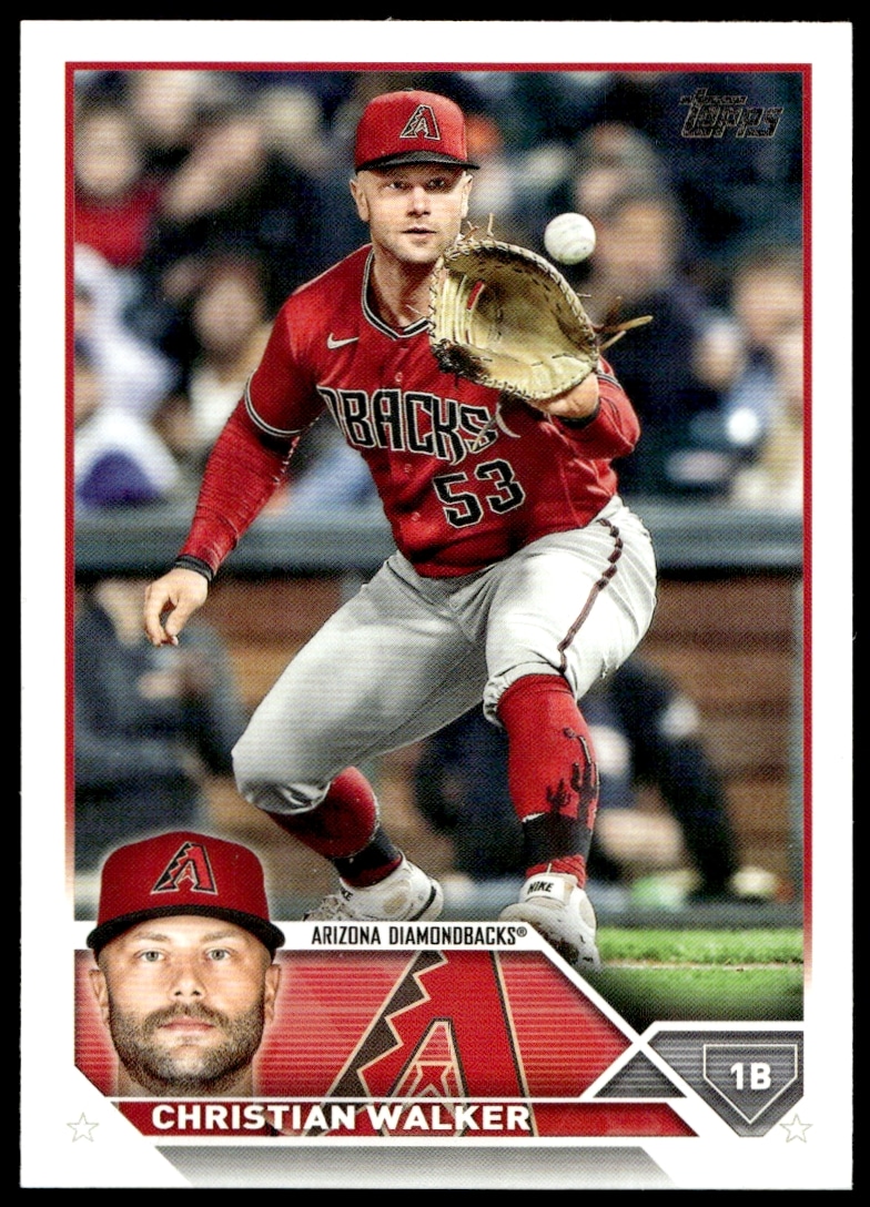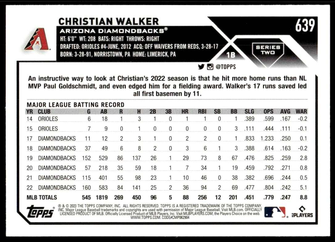 This Baseball card, from 2023 is part of the Topps Series 1 card set. Christian Walker is featured and has a card number of 639.
