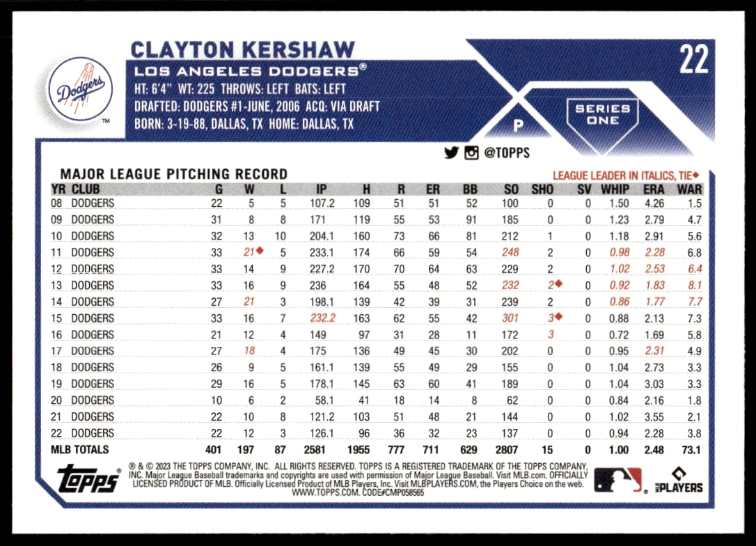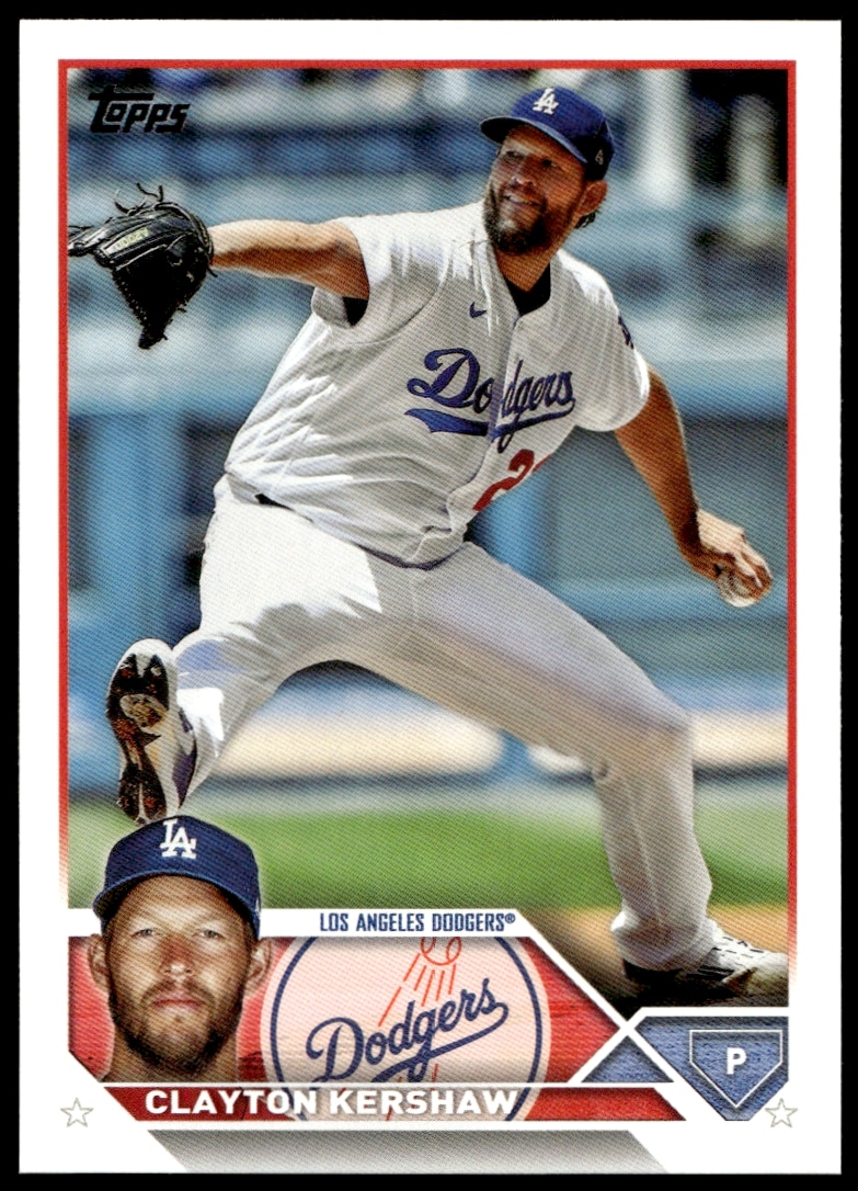 This Baseball card, from 2023 is part of the Topps Series 1 card set. Clayton Kershaw is featured and has a card number of 22.
