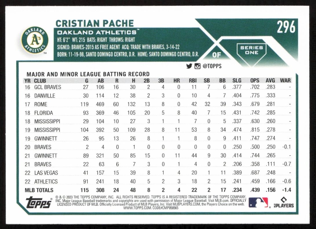 This Baseball card, from 2023 is part of the Topps Series 1 card set. Cristian Pache is featured and has a card number of 296.