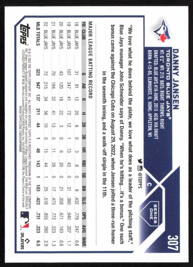 This Baseball card, from 2023 is part of the Topps Series 1 card set. Danny Jansen is featured and has a card number of 307.