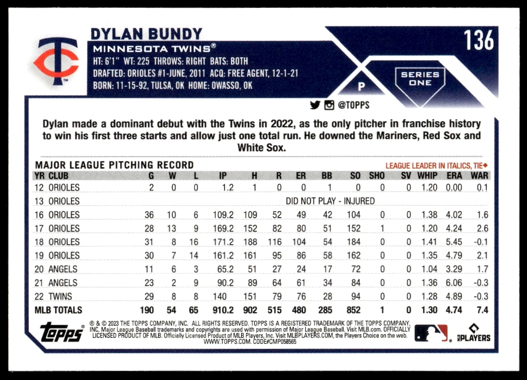 This Baseball card, from 2023 is part of the Topps Series 1 card set. Dylan Bundy is featured and has a card number of 136.