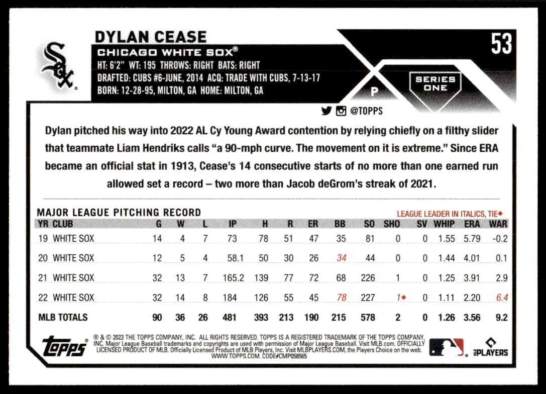 This Baseball card, from 2023 is part of the Topps Series 1 card set. Dylan Cease is featured and has a card number of 53.