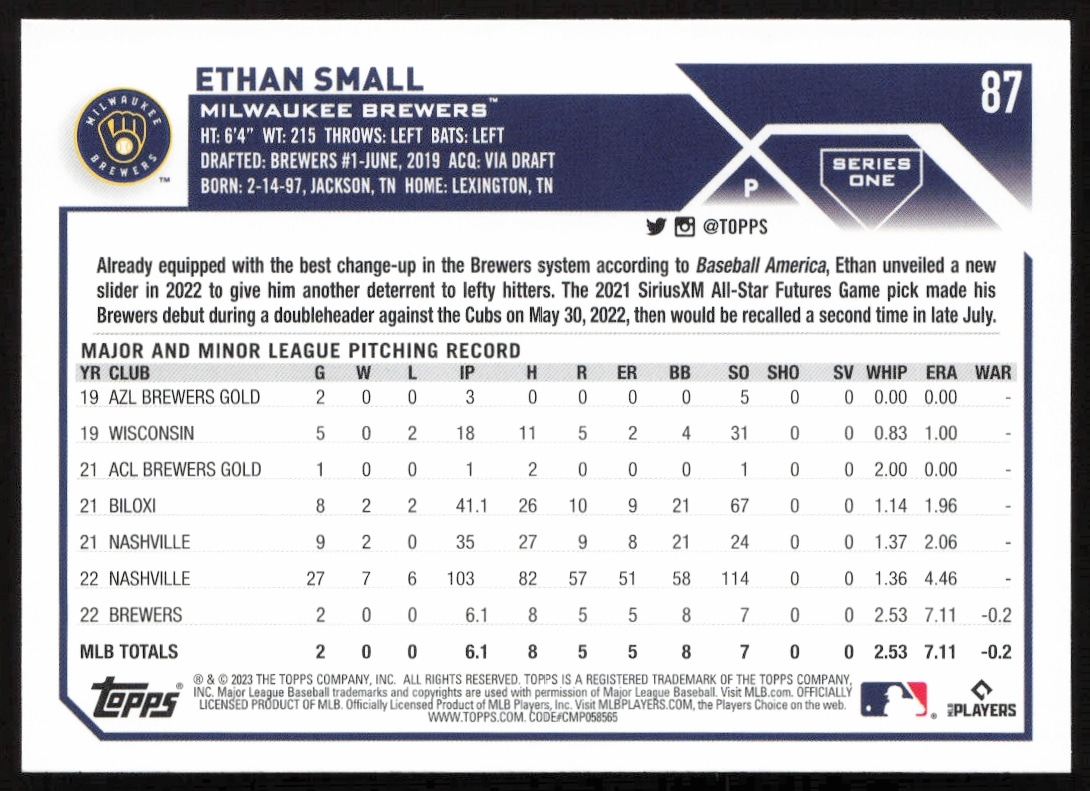This Baseball card, from 2023 is part of the Topps Series 1 card set. Ethan Small is featured and has a card number of 87.