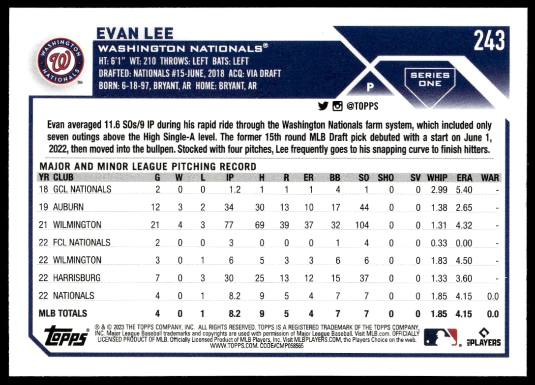 This Baseball card, from 2023 is part of the Topps Series 1 card set. Evan Lee is featured and has a card number of 243.