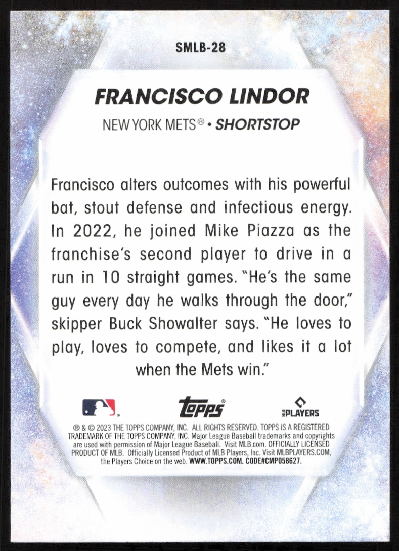 This Baseball card, from 2023 is part of the Topps Series 1 card set. Francisco Lindor is featured and has a card number of SMLB-28.