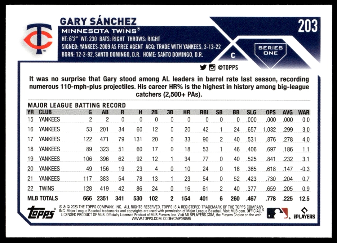 This Baseball card, from 2023 is part of the Topps Series 1 card set. Gary Sanchez is featured and has a card number of 203.