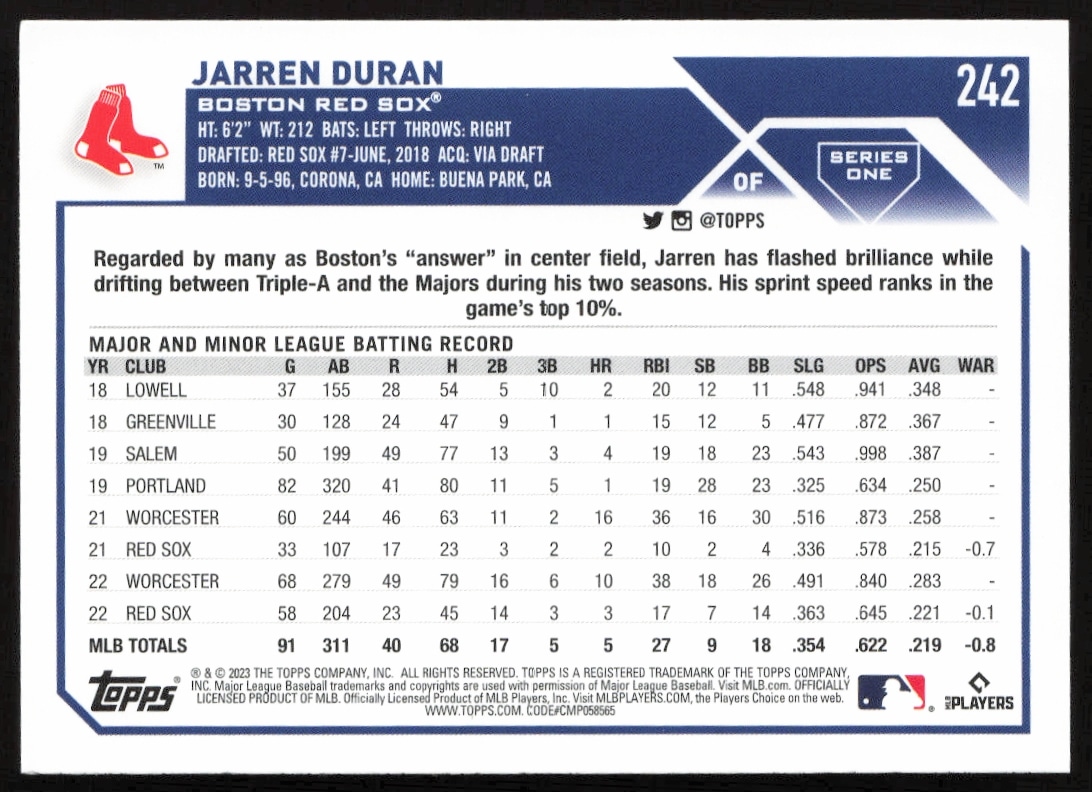This Baseball card, from 2023 is part of the Topps Series 1 card set. Jarren Duran is featured and has a card number of 242.