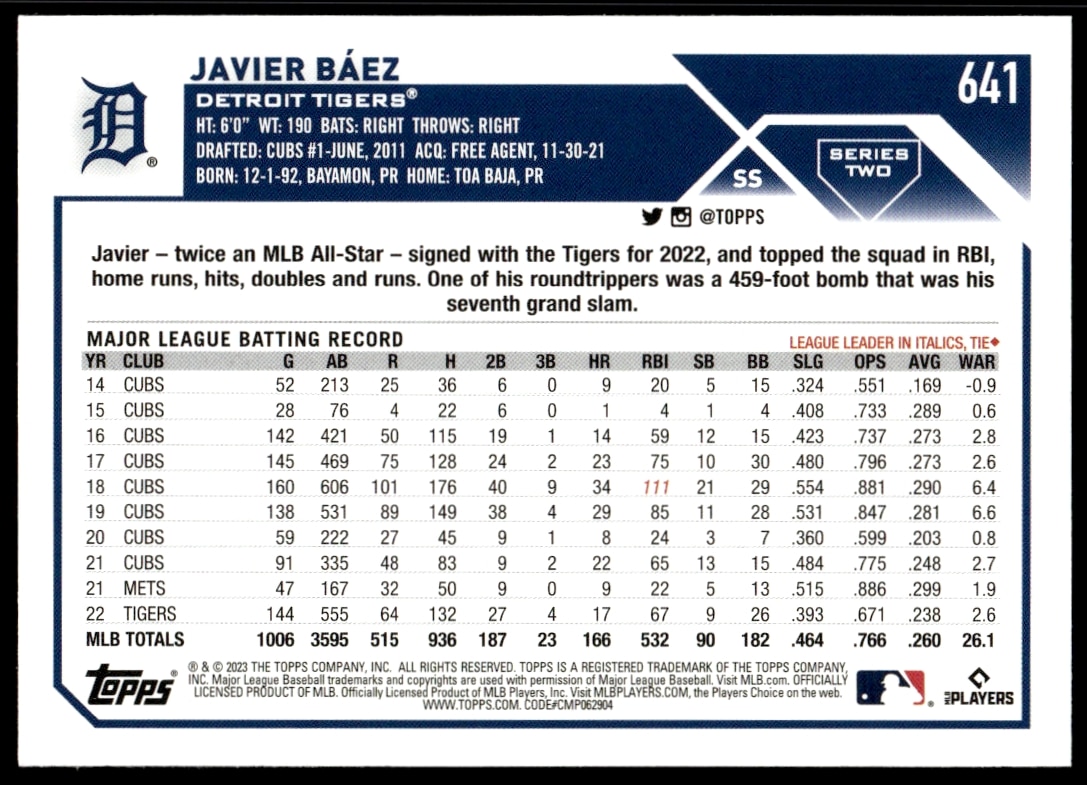 This Baseball card, from 2023 is part of the Topps Series 1 card set. Javier Baez is featured and has a card number of 641.