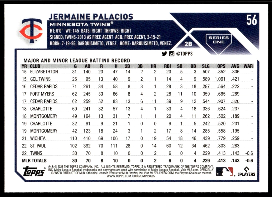 This Baseball card, from 2023 is part of the Topps Series 1 card set. Jermaine Palacios is featured and has a card number of 56.